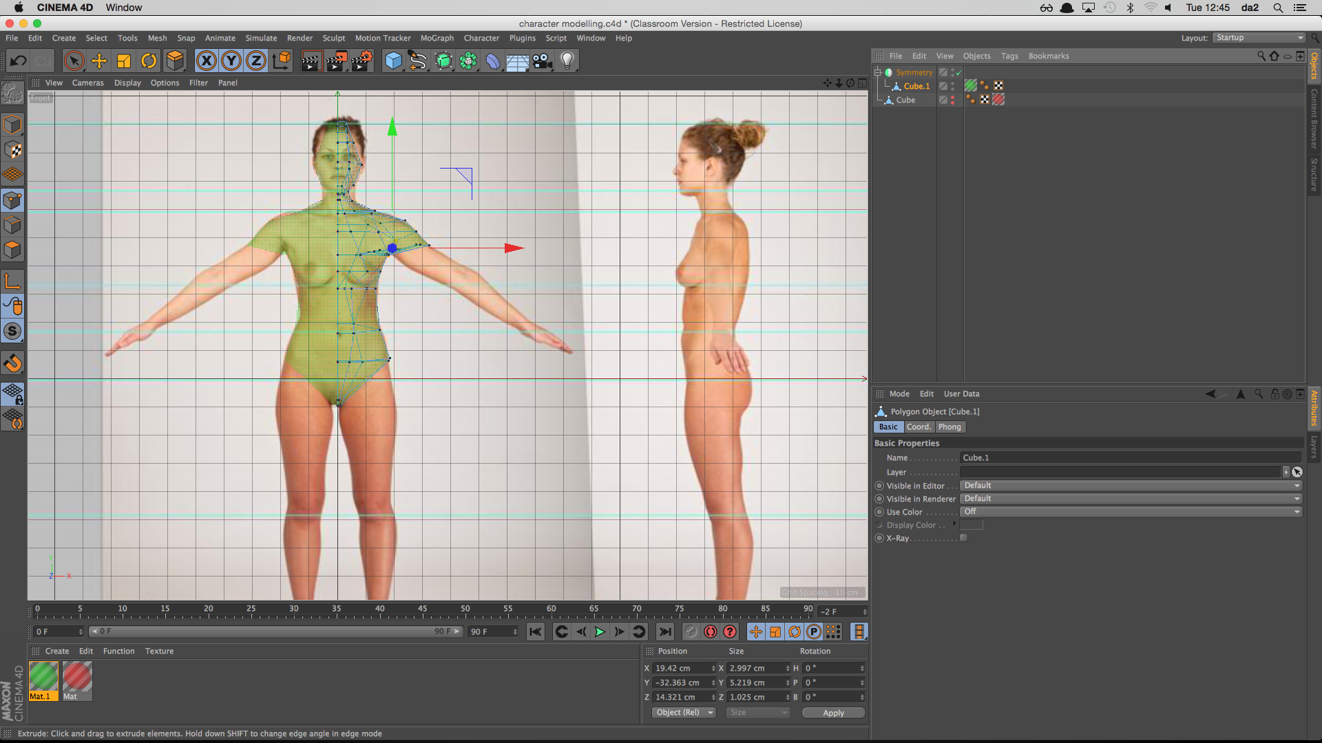 We set the background of the front and side views with picture of someone in a cruciform character modelling pose, and loaded in a cube.