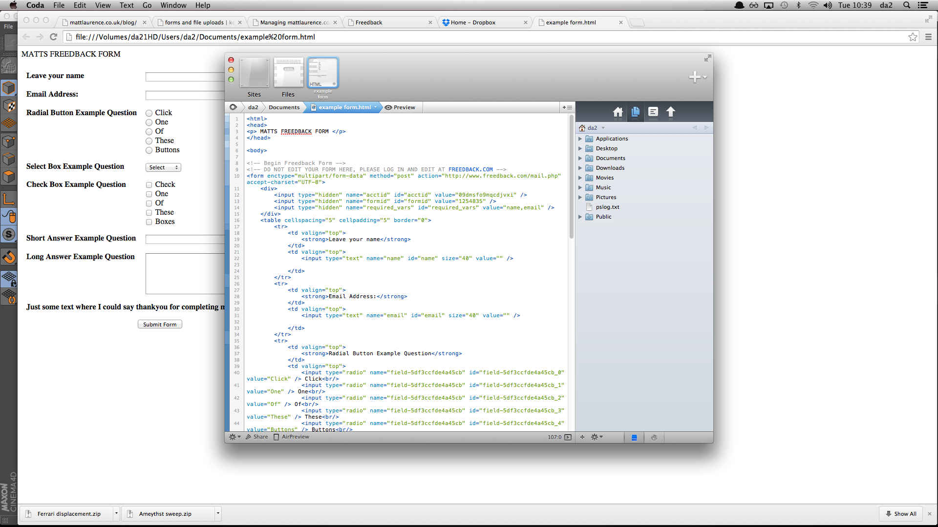 This is the code the tool produced and what I copied into my coda file. On the right is a preview of what the form page looks like through a browser.