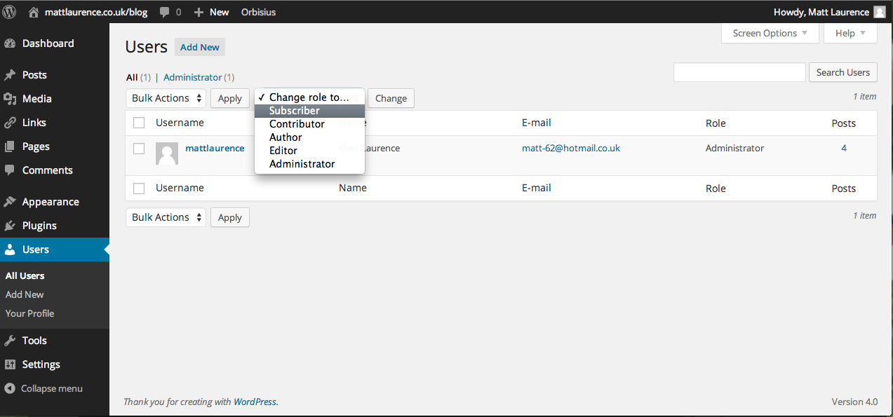 As its my site i’m an administrator (of course!), but there are the options for Editor, Author, Contributor and Subscriber. Essentially an Subscriber can only view the site, whereas an editor can write and publish his own posts, or deal with comments etc with authors and contributors controls falling somewhere in the middle.