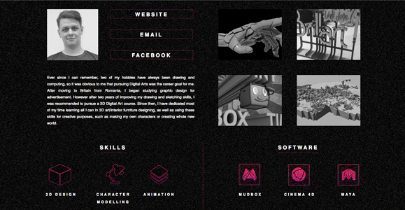 One of the ways to enable visitors of the show to find us afterwards and so we could commemorate the class graduating, was to create a website matching the shows theme. As per I used Webydo to create the site and used the same techniques I did on the posters to create all the illustrations we needed. Each student has their own personal page, with relevant work and links so they can be contacted.