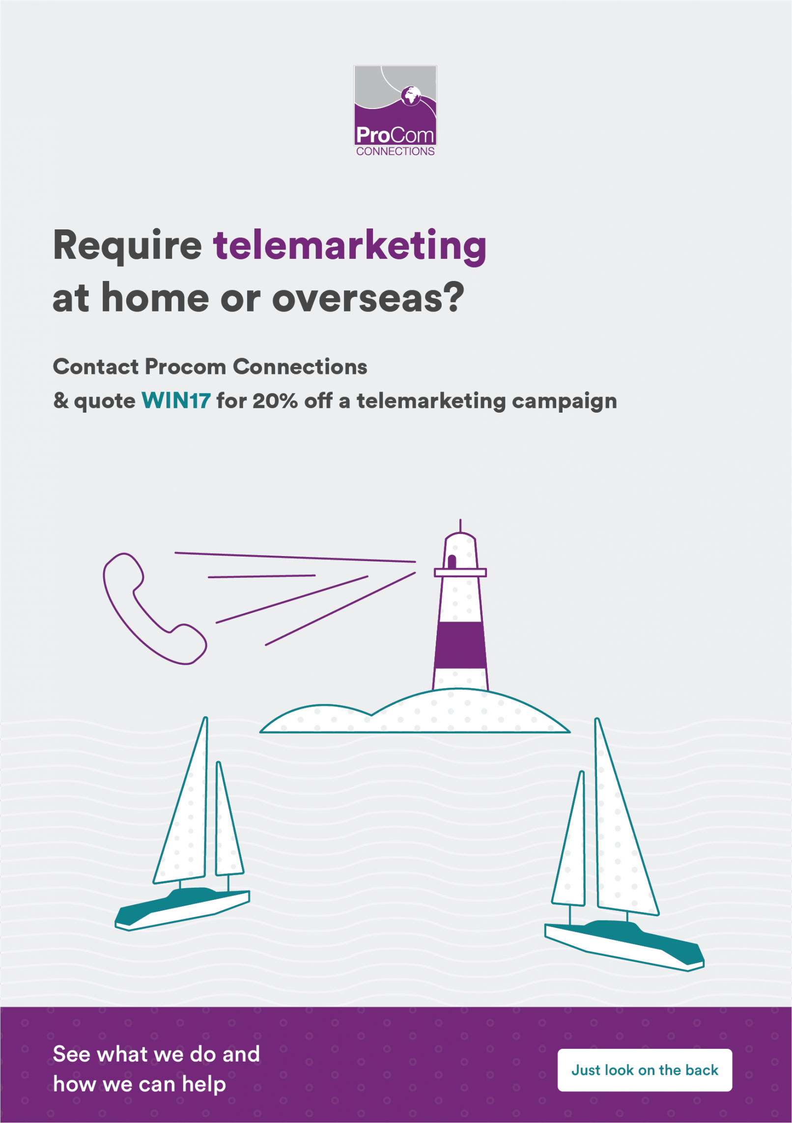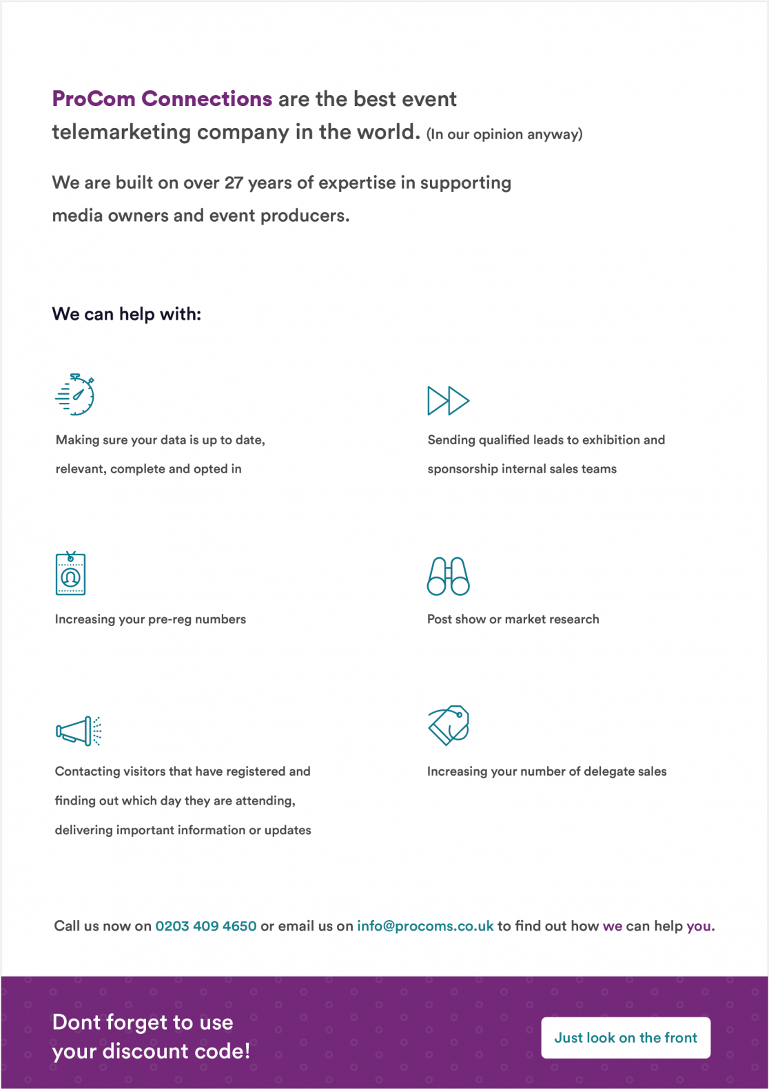 Procom Connections wanted me to design a two sided direct mail piece that could be sent out in the post.